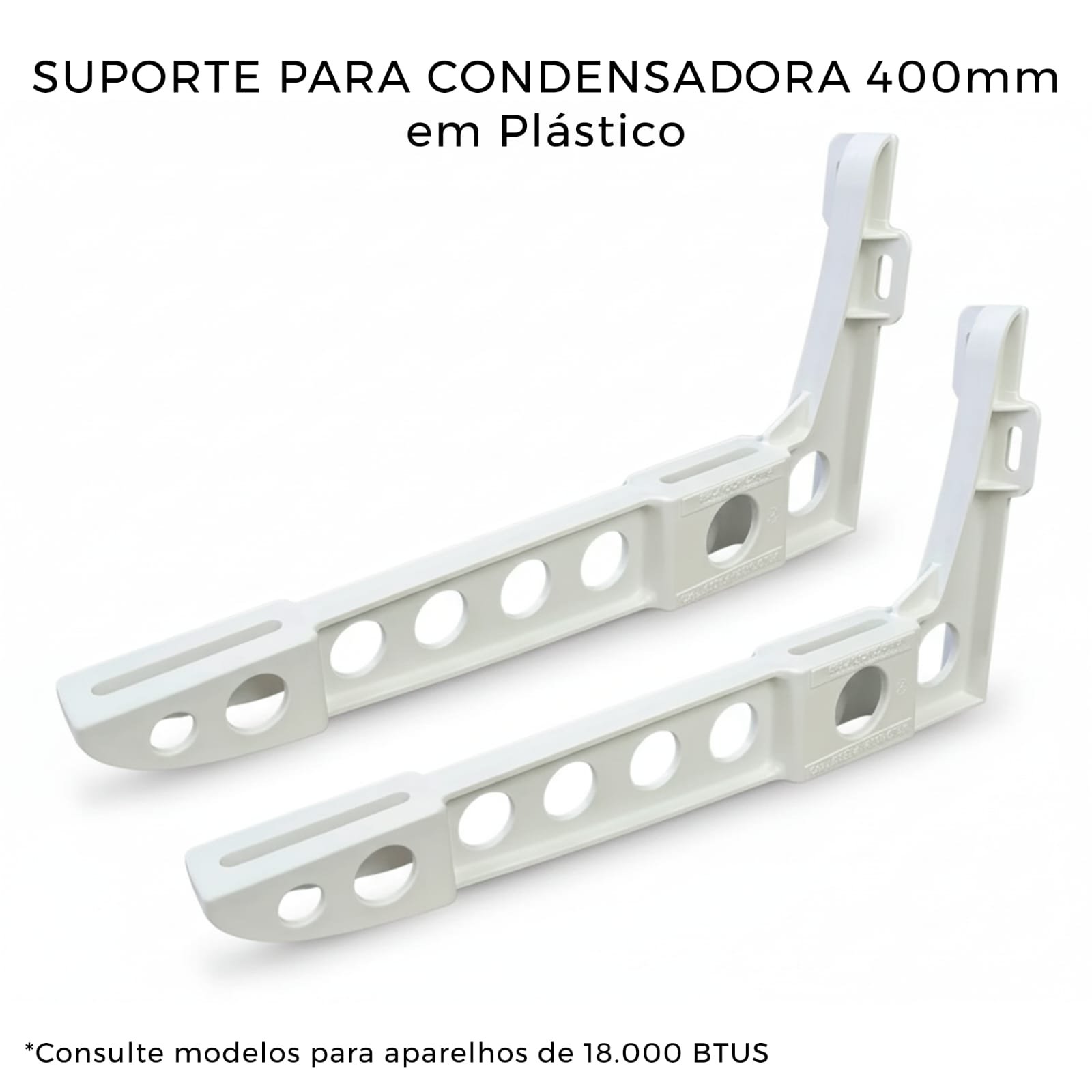 Capacidade de carga: Suporta unidades condensadoras de 7.000 a **18.000BTUs. – Tamanho: 400 mm, adequado para diversas marcas e modelos. – Design funcional: Leve, resistente e com acabamento branco discreto. –