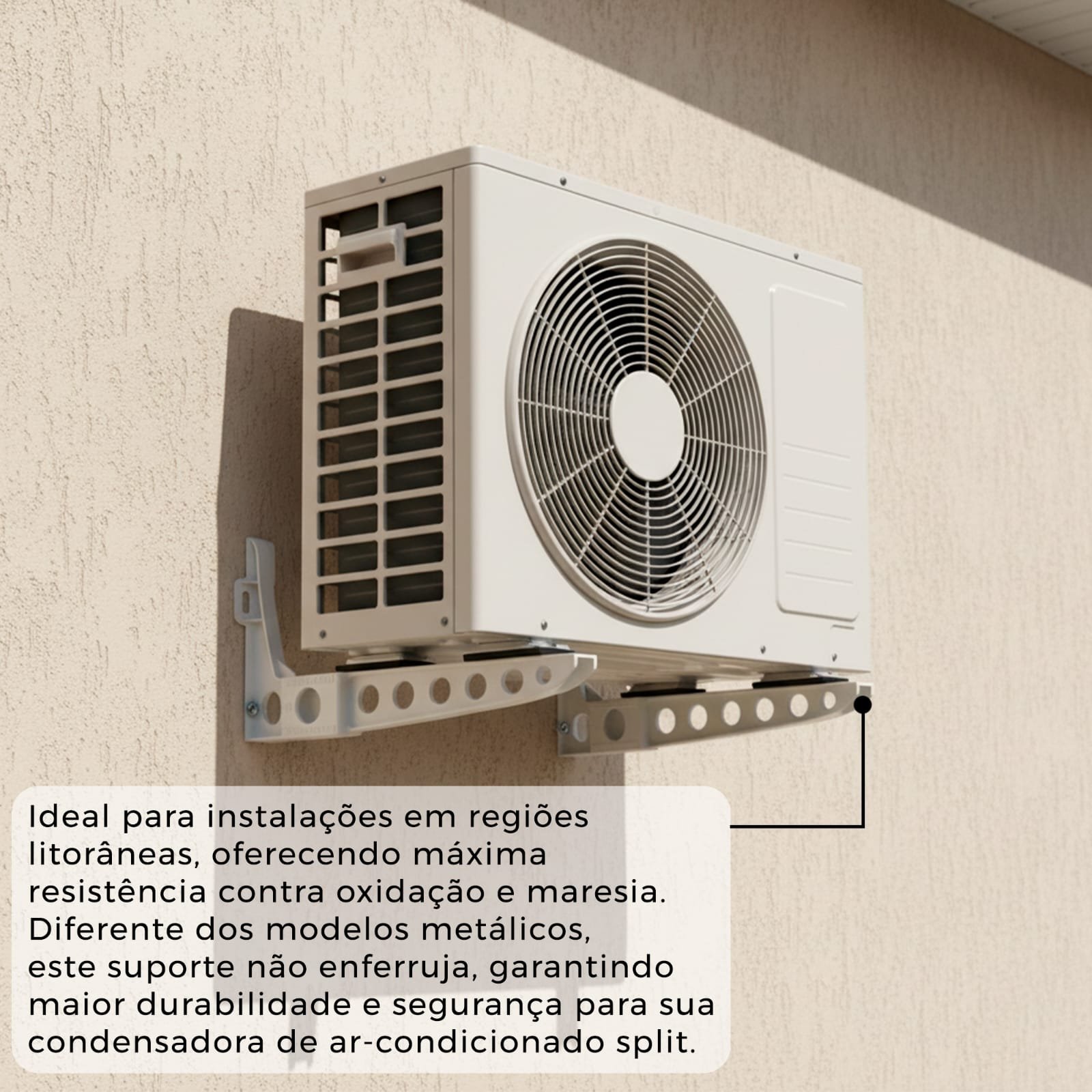 Diferente dos modelos metálicos, este suporte não enferruja, garantindo maior durabilidade e segurança para sua condensadora de ar-condicionado split.